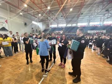 O tym, kto stanął na podium zdecydował test wiedzy. Dla laureatów przygotowaliśmy ciekawe nagrody, w tym drukarki i słuchawki multimedialne. Do grupy kibiców, którzy z największym zaangażowaniem dopingowali zawodników powędrowała duża paczka gadżetów od naszej Uczelni. Na trybunach zasiadło aż 250 osób!