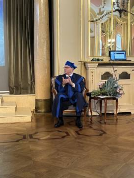 Nowy doktor honorowy wygłosił inspirujący wykład o przemianach w medycynie ostatnich dekad, podkreślając wagę łączenia wiedzy medycznej z troską o pacjenta.